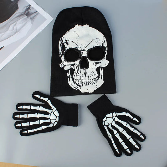 Black and white skull gloves and hats for men and women Halloween party dress up suitable for outdoor windproof and warm keeping