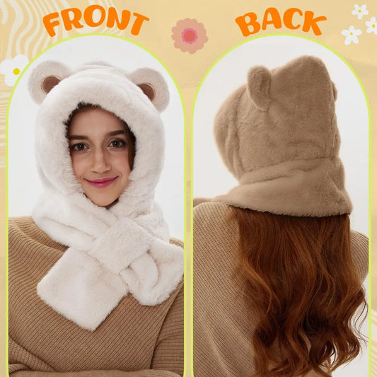 1pc Hat and Neck Integrated Set for Women Winter Warm Hooded Warm Scarf Fluffy Soft Bear Warmer Neck 2-in-1 Hat for Cold Weather